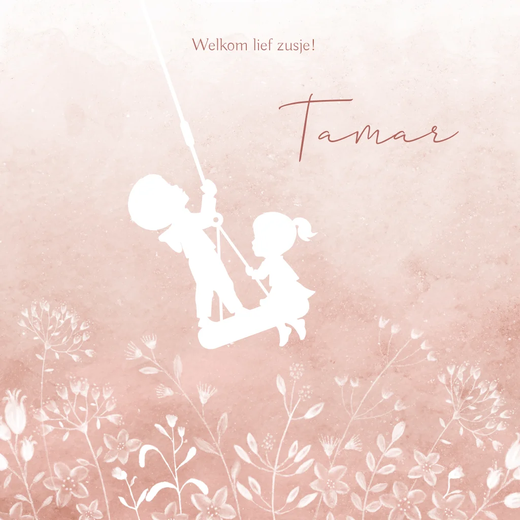 Lief geboortekaartje voor zusje met schommel en watercolour bloemen