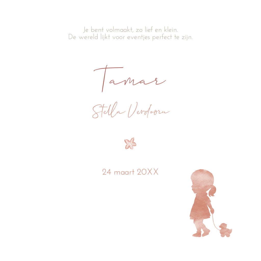 Lief geboortekaartje voor de geboorte van jullie tweede kindje, een meisje! Op het kaartje staat een silhouet van een jongen en een meisje samen op een schommel met daar omheen handgetekende bloemetjes. De combinatie van de roestbruine tinten op de achtergrond en de getekende veld bloemen maken het kaartje lief en romantisch.