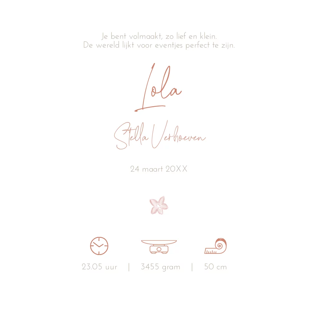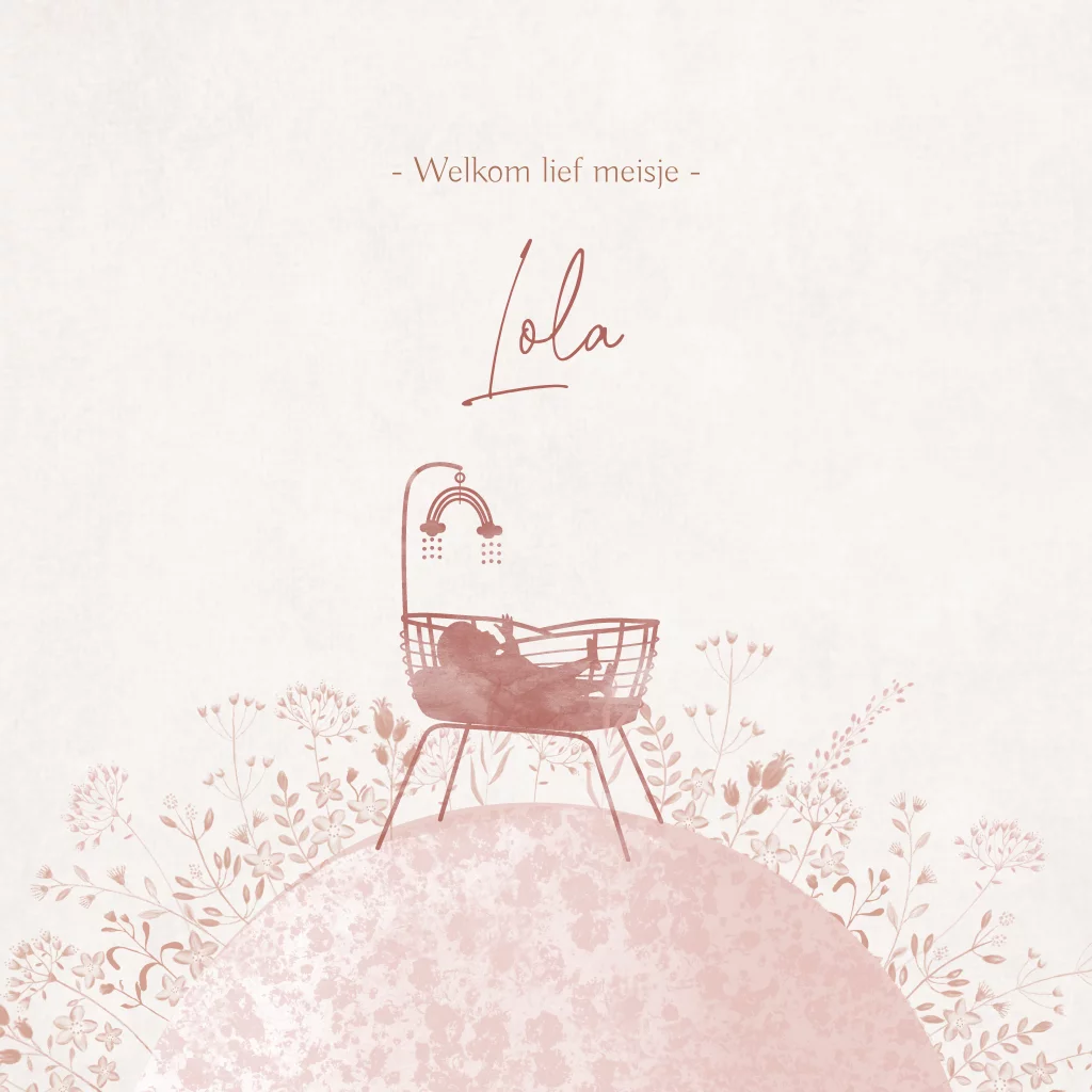 Lief watercolour geboortekaartje voor de geboorte van jullie kindje. Het kaartje heeft een roze achtergrond met daarop een silhouetje van een baby in een wiegje. Daarnaast zie je handgetekende bloemetjes en een wereldbol. Pas het ontwerp naar wens aan in onze online editor.