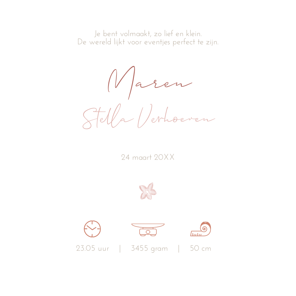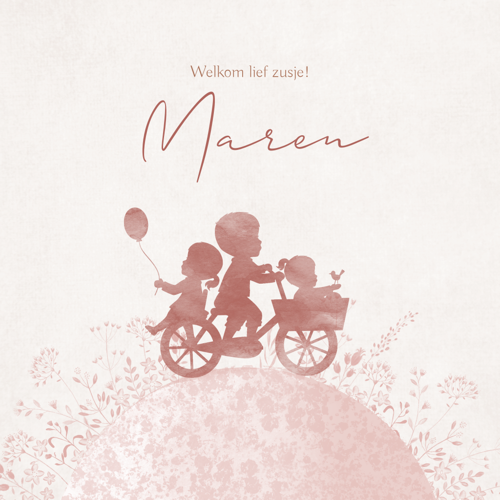 Lief geboortekaartje voor de geboorte van jullie derde kindje. Het kaartje heeft een watercolour silhouet van een meisje met broertje en zusje op de fiets met handgetekende bloemetjes en een wereldbol. De combinatie van oudroze en zachte beige en roest bruine tinten maken het kaartje elegant. De watercolour doet de bloemen nog meer uitkomen en geeft een tof effect.