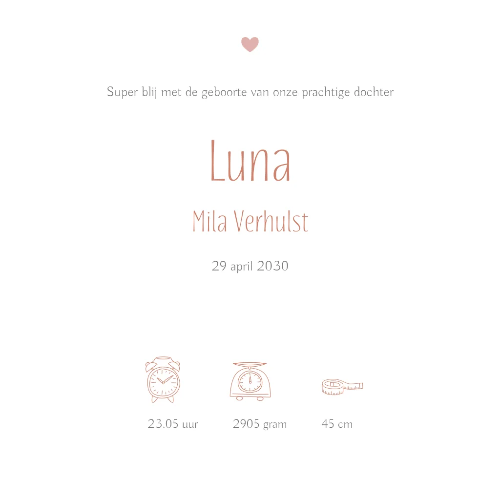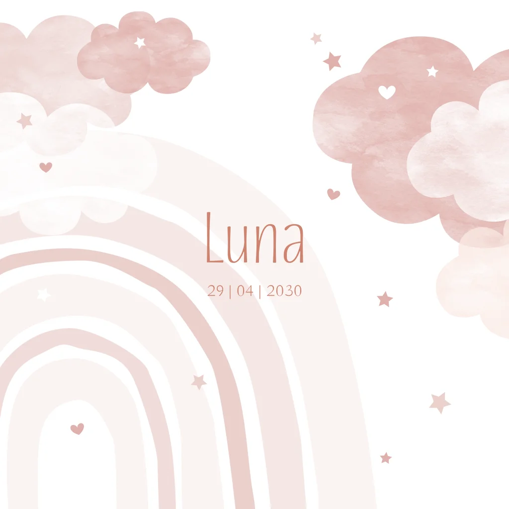 Een lief en dromerig geboortekaartje voor jouw meisje. Het kaartje heeft een roze watercolour elementen met onder andere wolkjes, regenboogjes en sterretjes. In het midden van het kaartje lees je de naam van het kindje.