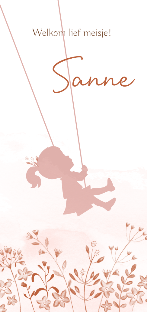 Lief waterverf geboortekaartje met een silhouet van een meisje op een schommel en verschillende veldbloemen. Alle elementen uit deze kaart kun je eenvoudig in kleur en grootte aanpassen met onze online editor.