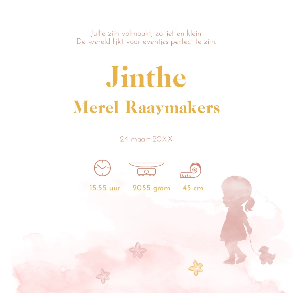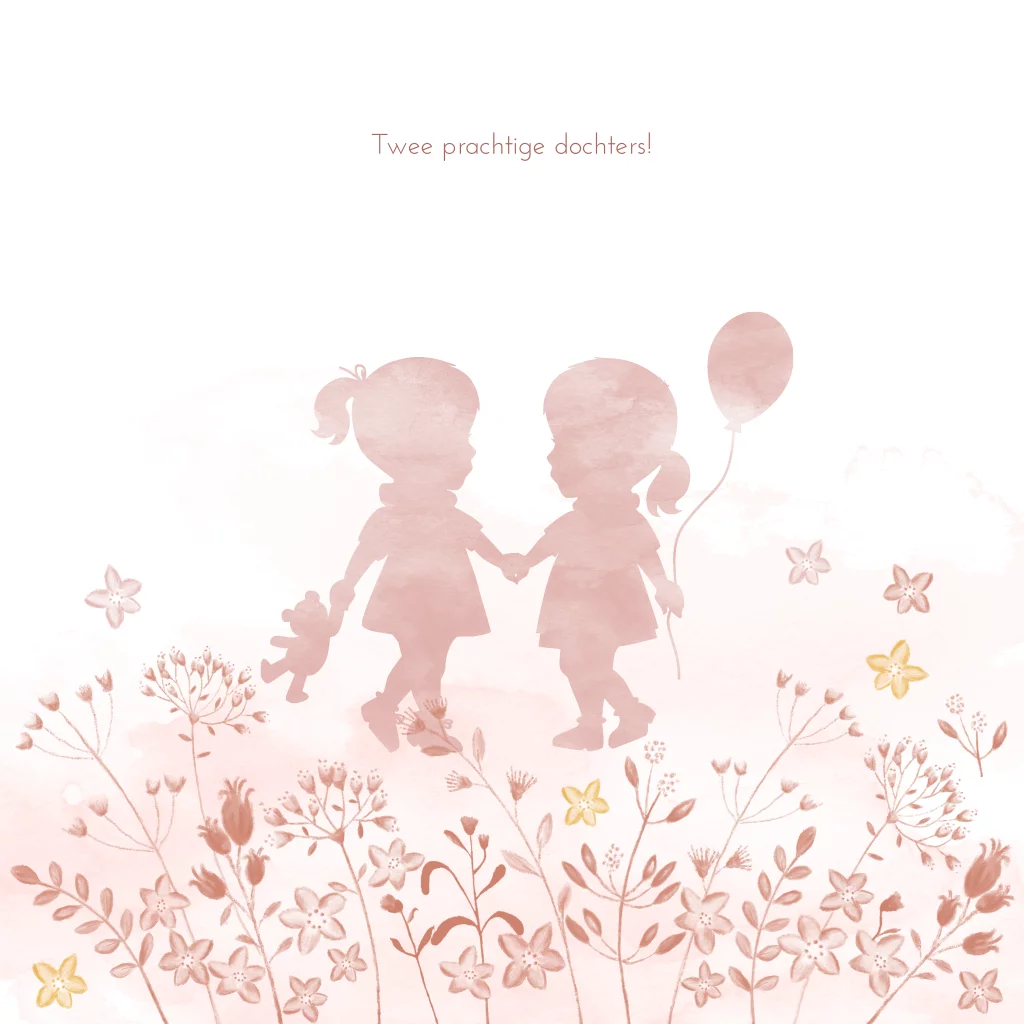 Lief geboortekaartje voor een meisjes tweeling. Het kaartje heeft verschillende roze watercolour elementjes. Je ziet daarnaast twee lieve silhouetjes twee meisjes met handgetekende bloemetjes. Het kaartje heeft verder kleine goudfolie elementjes.
