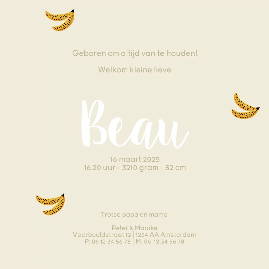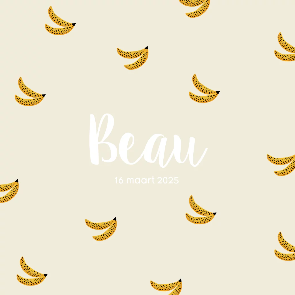 Een vrolijk em hip geboortekaartje voor jouw pasgeboren kindje. Het kaartje heeft een design met bananen. Maak het kaartje helemaal naar wens in onze online editor.