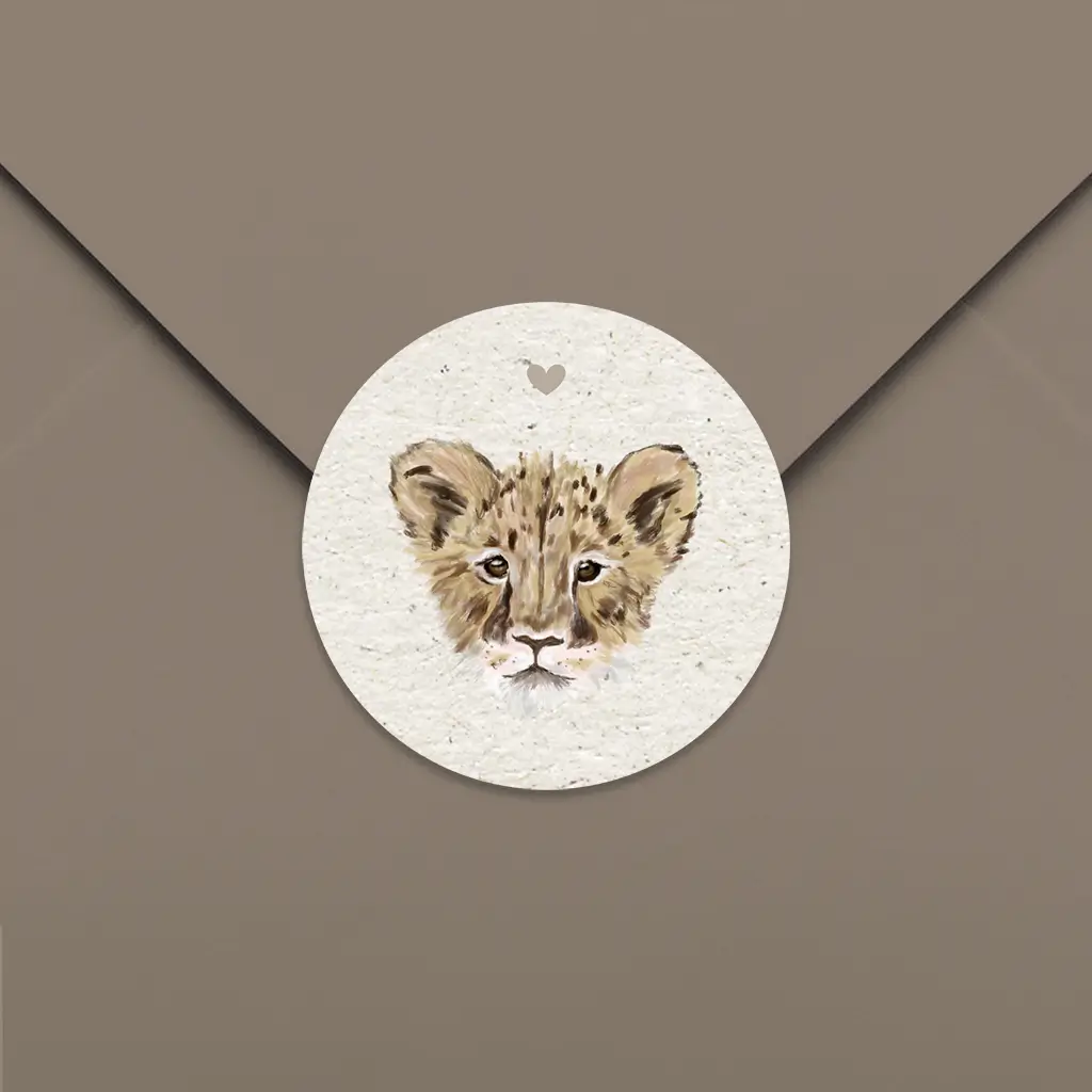 Een bijpassende sluitsticker voor het geboortekaartje. De sticker heeft een beige achtergrond met daarop een illustratie van een leeuwtje. Pas het ontwerp naar wens zelf aan.
