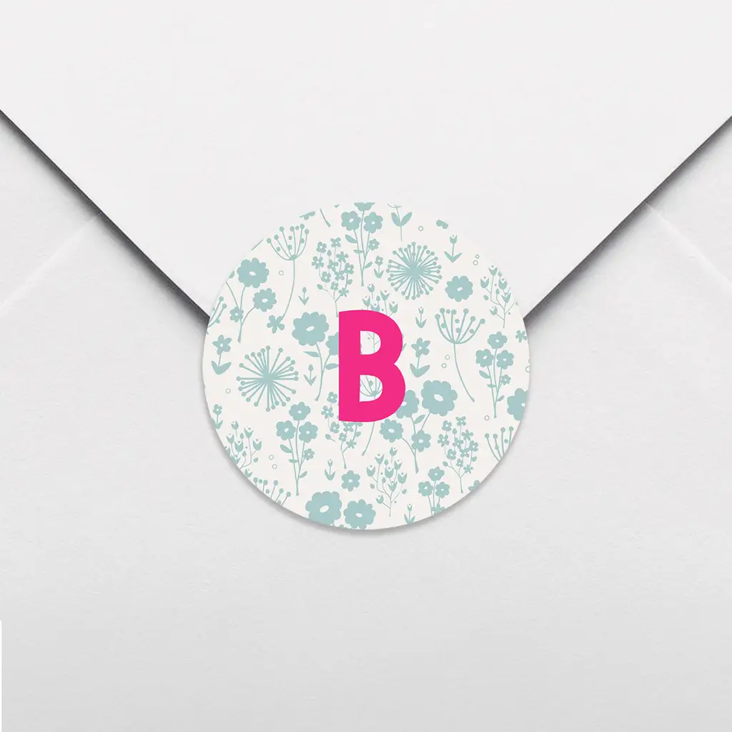 Een vrolijke sluitsticker met blauw bloemenpatroon. Daarop is de eerste letter van de naam te zien in felroze kleur. Pas de sticker naar wens aan in onze online editor. De sluitstickers hebben een diameter van 35 mm en worden geleverd op vellen van 25 stuks.