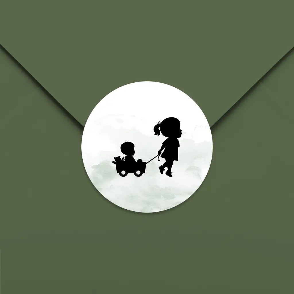 Een lieve sluitsticker passend bij jouw geboortekaartje. Deze sticker heeft een groene watercolour achtergrond met daarop lieve silhouetjes van een grote zus met haar broertje. Pas de sticker naar wens aan in onze editor. De sluitstickers hebben een diameter van 35 mm en worden geleverd op vellen van 25 stuks.