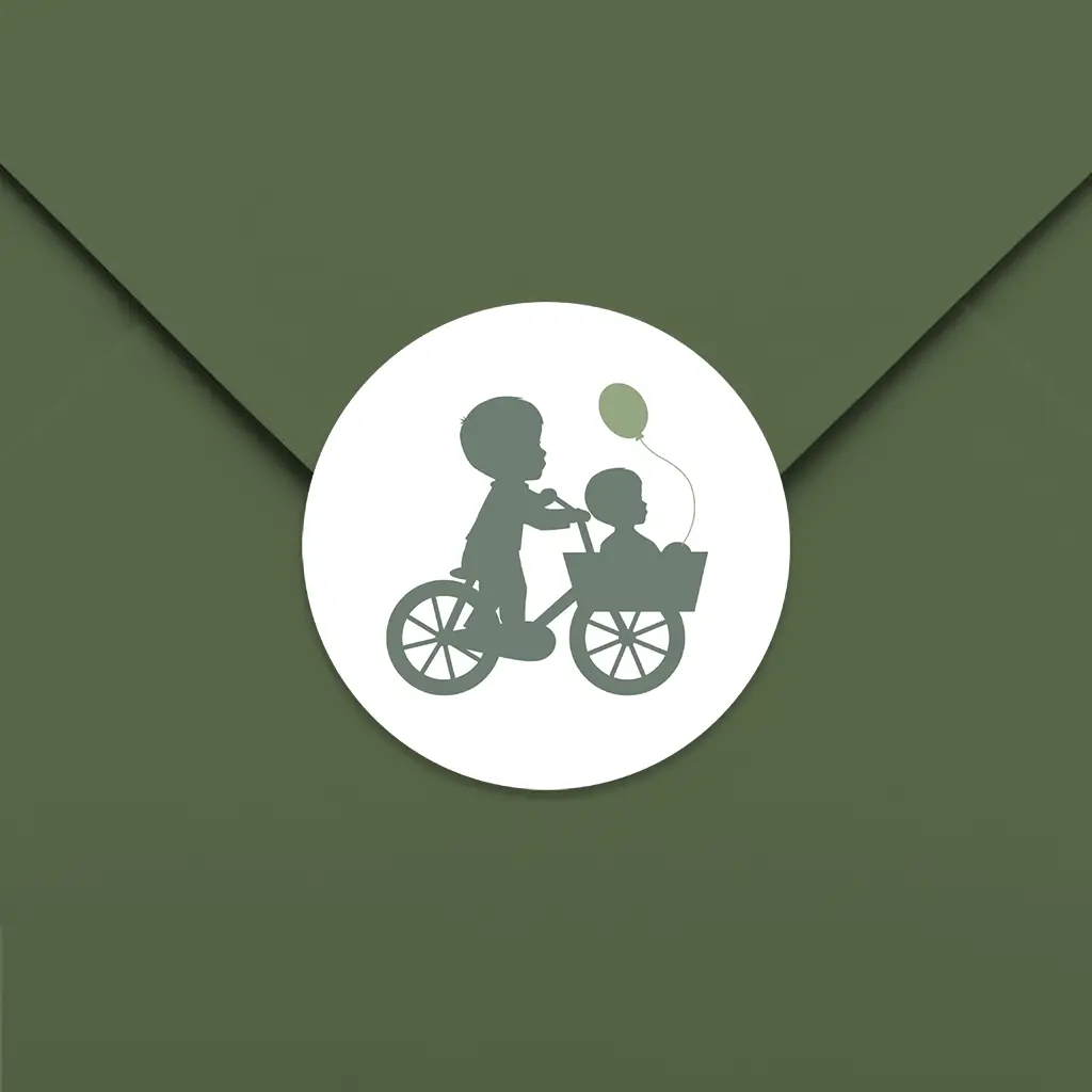 Een hippe sluitzegel met twee broertjes op de fiets, pas zelf de kleuren aan in onze online editor. Deze sticker past bij de geboortekaartjes van designer JilleJille. De sluitstickers hebben een diameter van 35 mm en worden geleverd op vellen van 25 stuks.