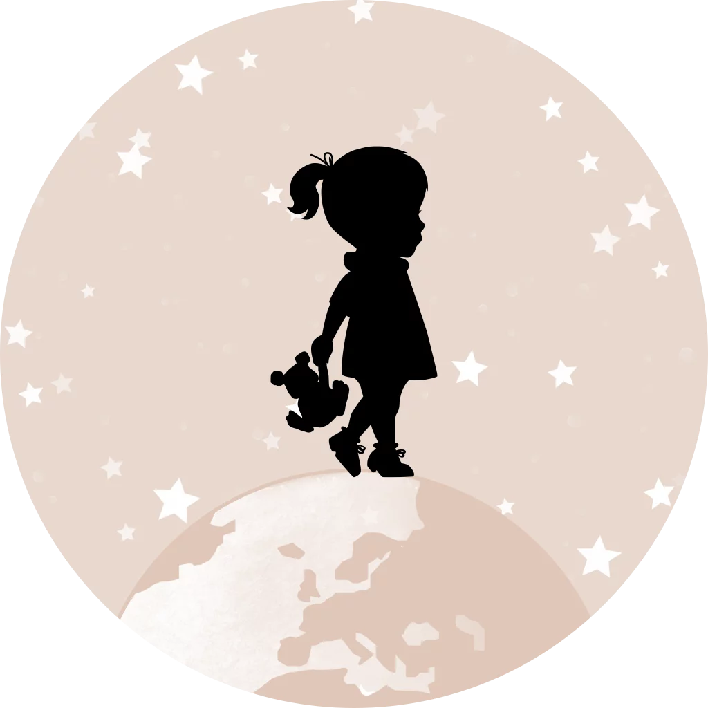 Lieve sluitstickers in de stijl van het geboortekaartje, een meisje met knuffel staat op een wereldbol. Het silhouet van het meisje is zwart, de achtergrond met sterren is pastelroze en wit.