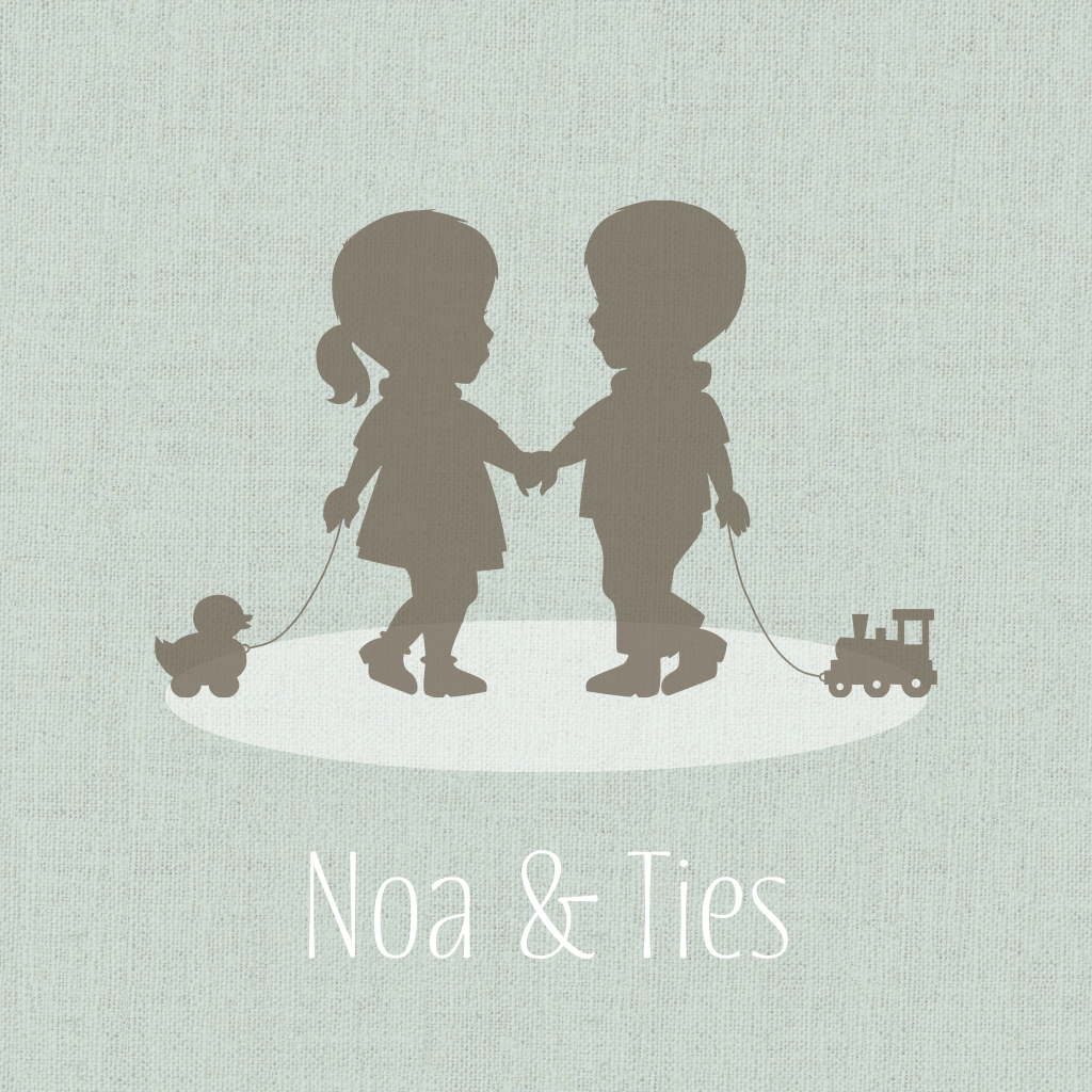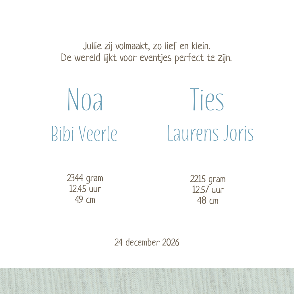 Mooie tweelingkaart voor jongen en meisje op linnen. Verander zelf eenvoudig de kleuren. Tip: bestel het geboortekaartje op oudhollands papier.