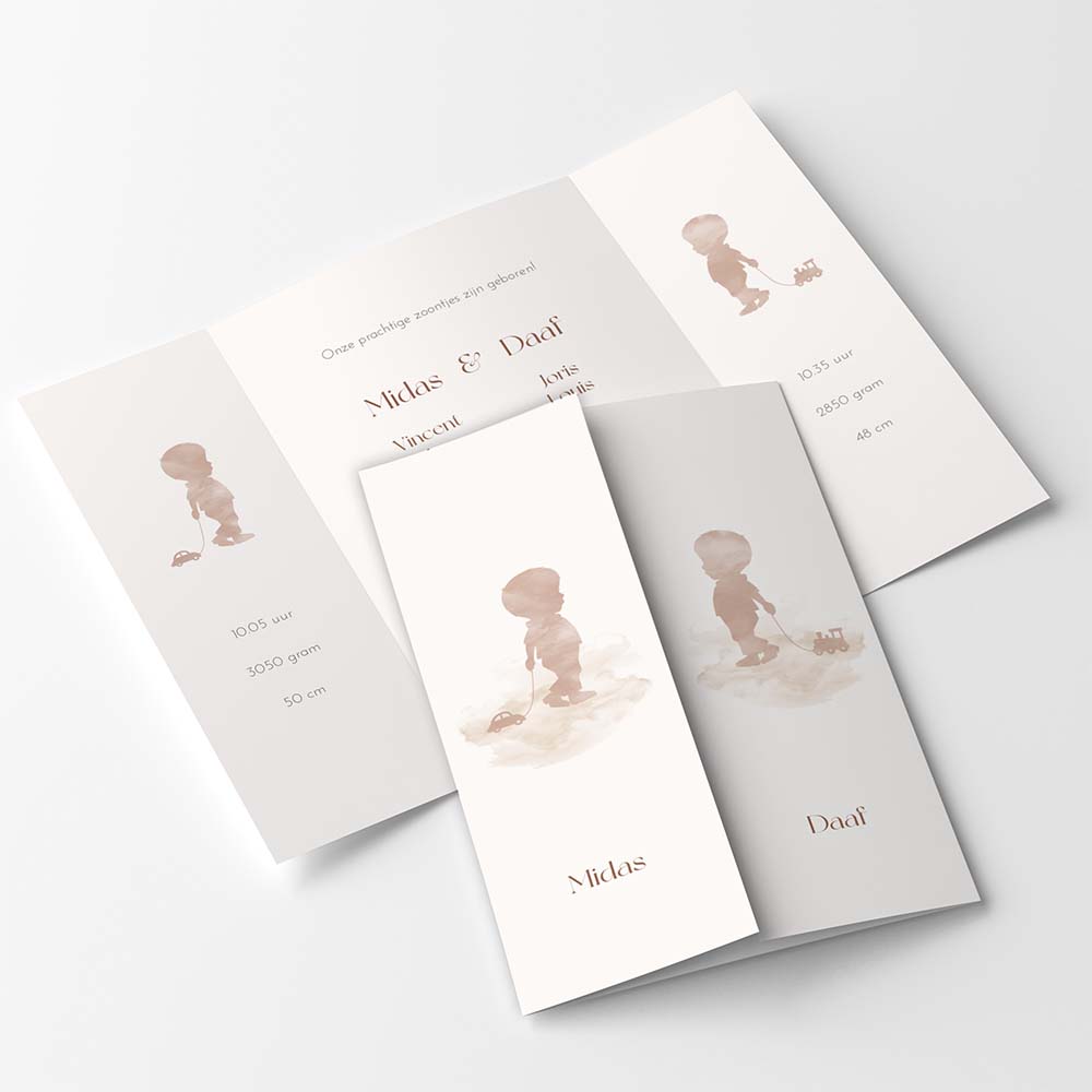 Prachtige tweelingkaart met silhouet van jongens in neutrale kleuren