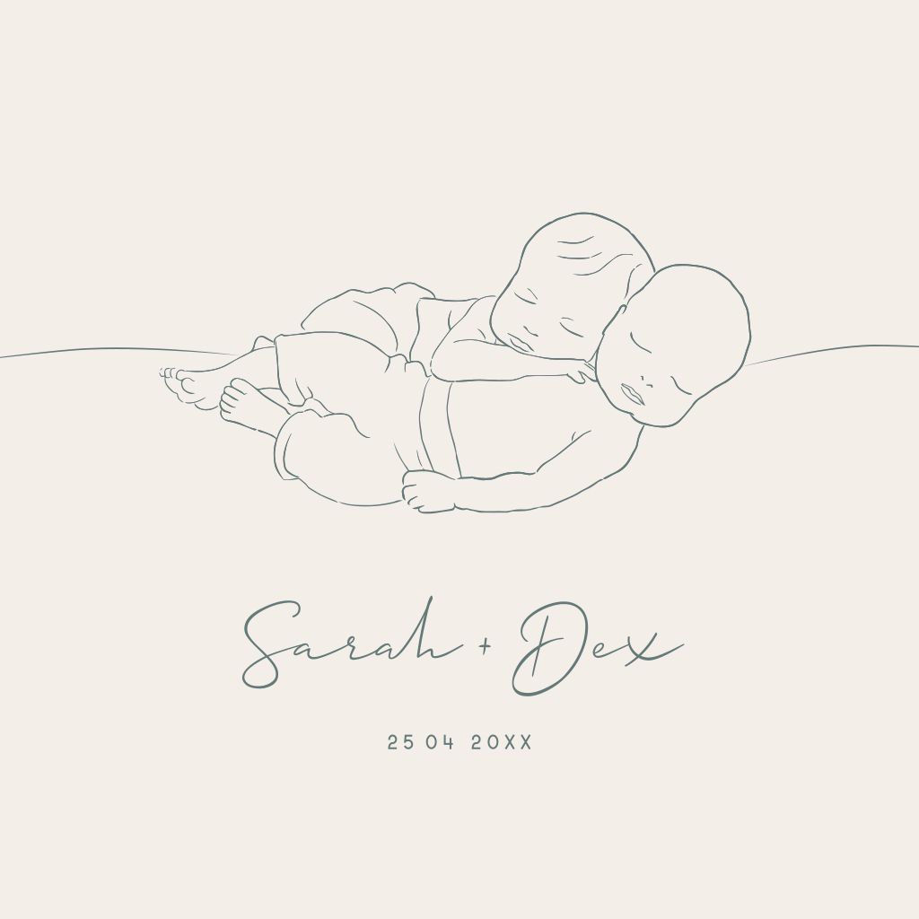 Mooie unisex tweelingkaart met een lijntekening van twee baby's slapend bij elkaar. Dit kaartje kun je eenvoudig zelf bewerken door de kleuren en teksten aan te passen.