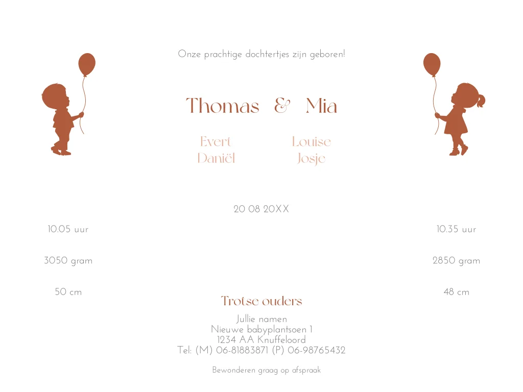 Een mooie tweelingkaart voor een zoontje en een dochtertje! Dit schattige geboortekaartje met theatervouw voor twee kindjes kun je zelf bewerken door de kleuren en teksten aan te passen.