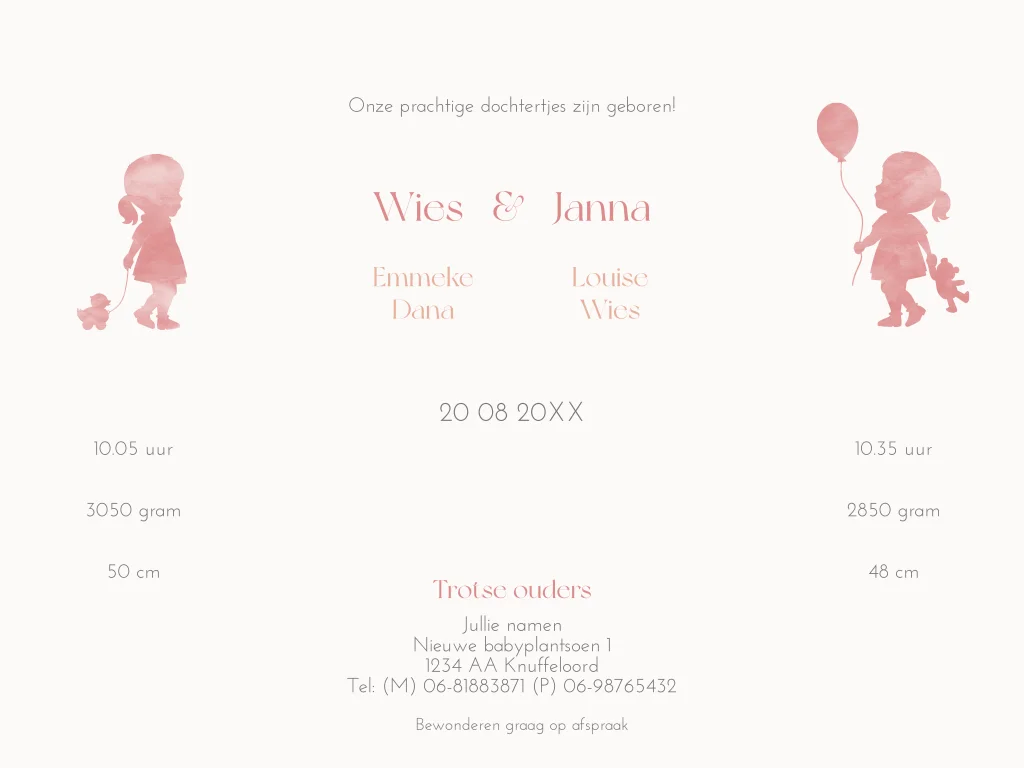Tweeling geboortekaartje met theatervouw en silhouet van twee meisjes