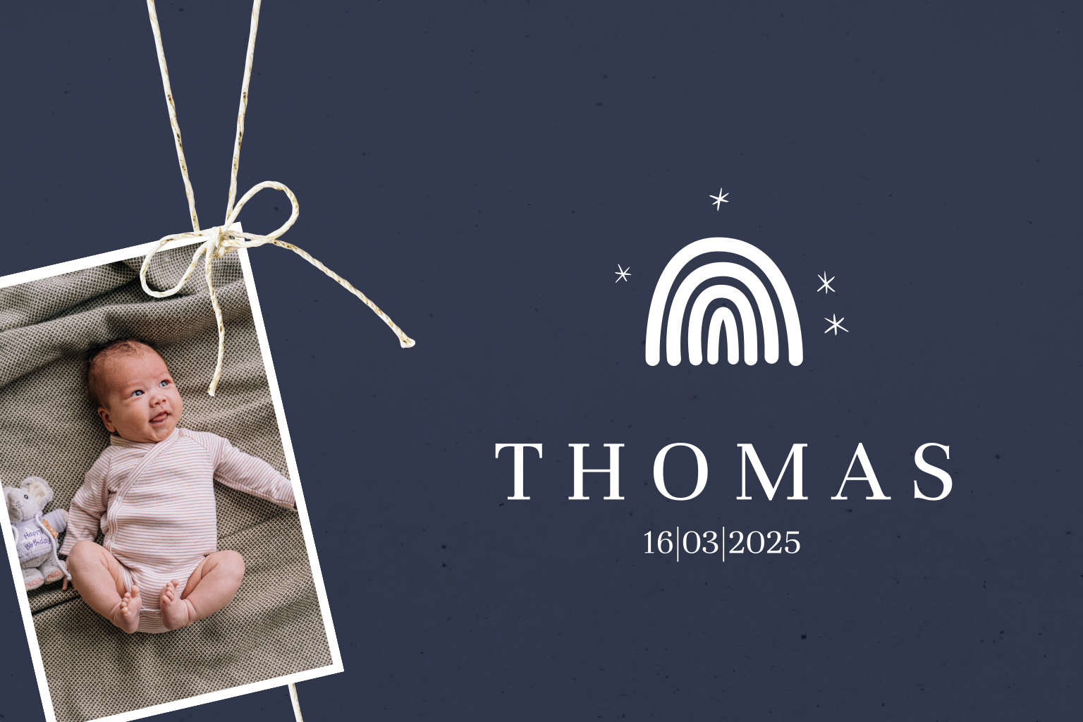 Trendy geboortekaartje met donkerblauwe achtergrond. Door deze donkerblauwe achtergrond springt de holografische folie er echt uit. Upload een eigen foto van jouw kleintje gemakkelijk op het kaartje. Het labeltje en touwtje op dit kaartje zijn gedrukt. Let op! Dit betekent dus dat je deze niet los erbij worden geleverd.