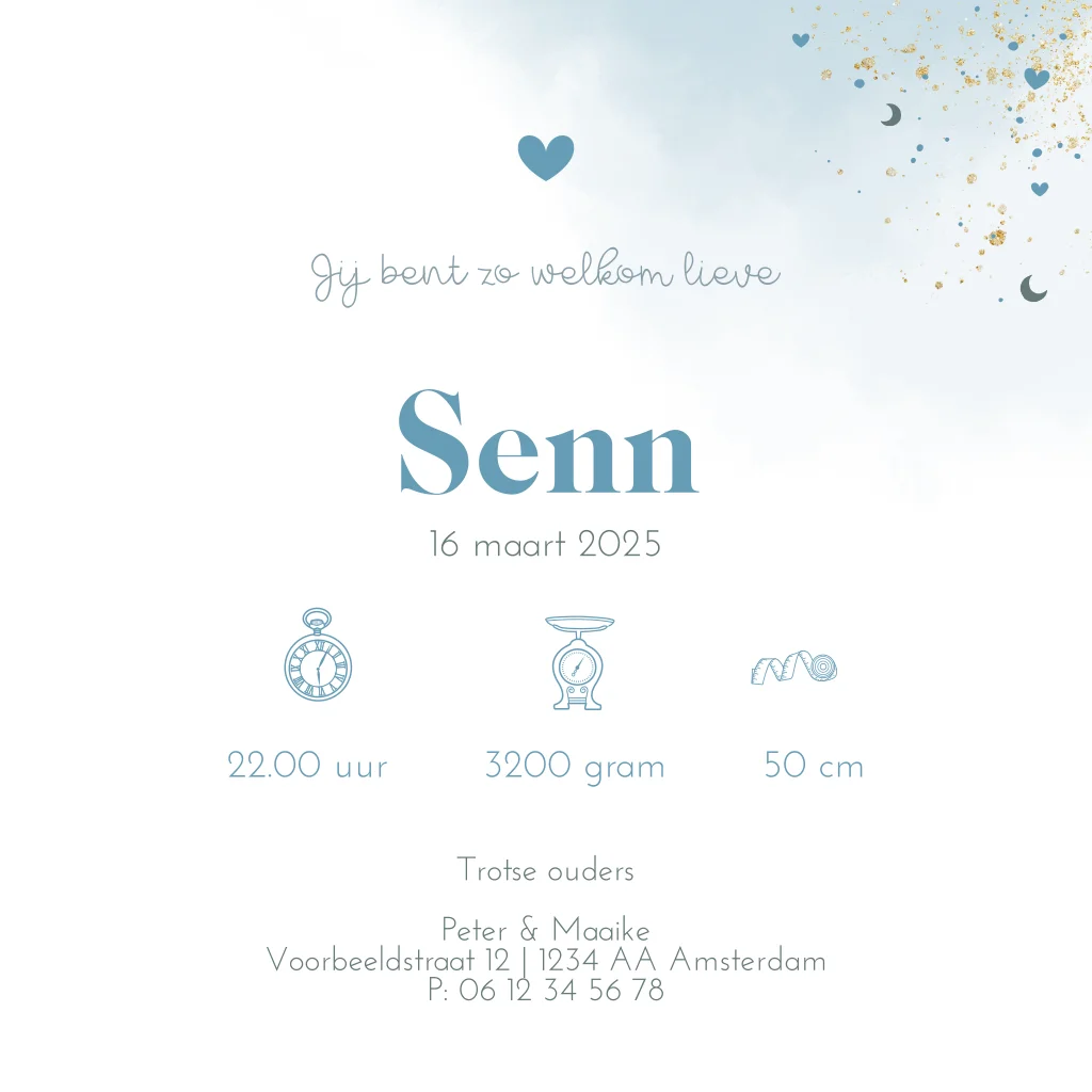 Een blauw lief geboortekaartje met watercolour achtergrond. Op de voorgrond zie je de naam gedrukt in blauwe hoogglans. Aan de zijkanten van het kaartje zie je spetters, hartjes en maantjes.