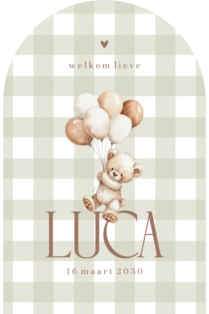Boog-geboortekaartje met beertje en ruitjespatroon