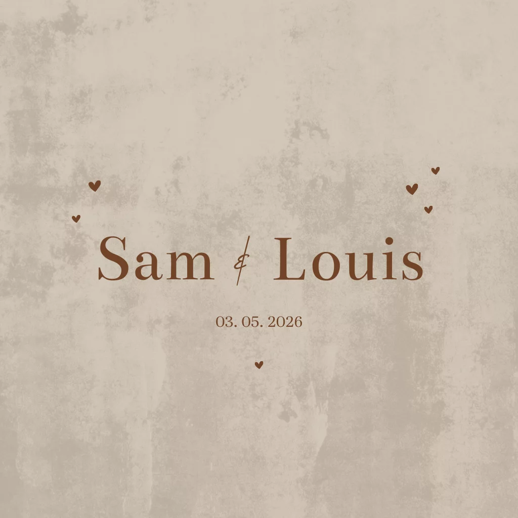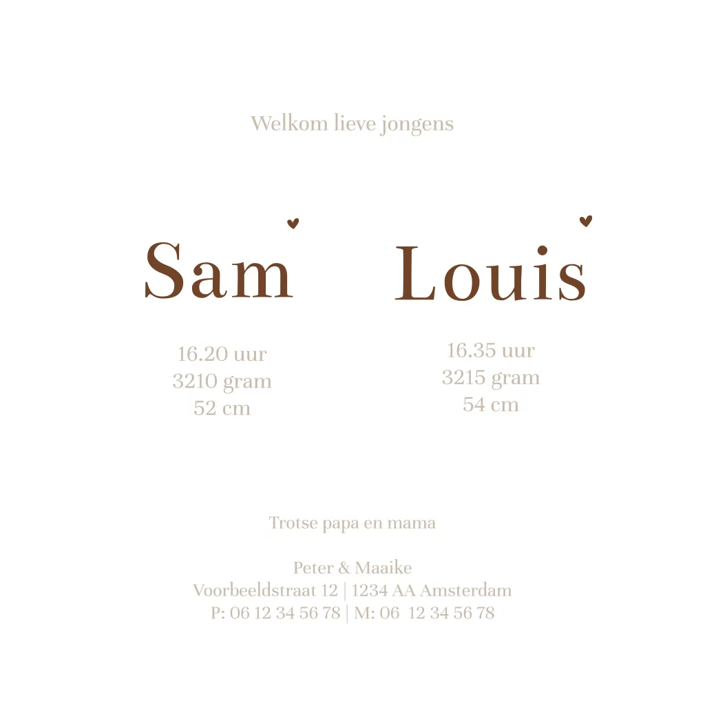 Kondig de geboorte van jullie tweeling aan met dit stoere kaartje! Het kaartje heeft een bruine velvet-look achtergrond. De kleine hartjes geven dit kaartje een lieve uitstraling. Pas het kaartje naar wens aan in onze online editor en bestel een proefdruk om dit kaartje in het echt te zien!