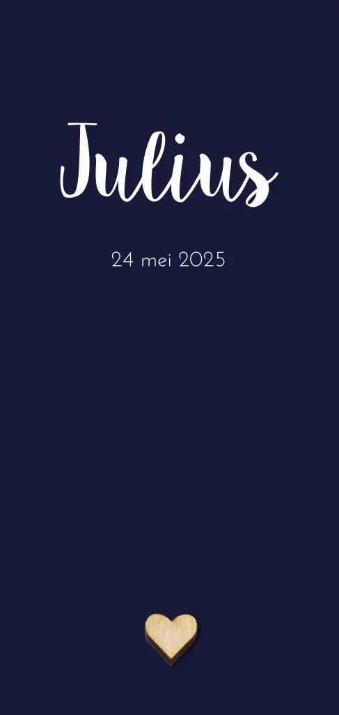 Stoer donkerblauw geboortekaartje met een bij te bestellen houten hartje. Minimalistisch, hip en stoer tegelijk.
