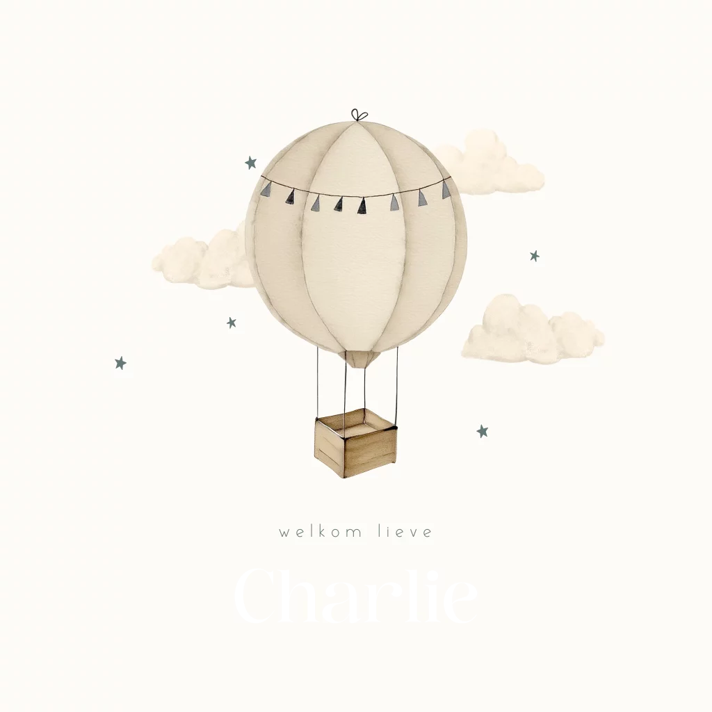 Wat een lief geboortekaartje voor jouw kindje. Het kaartje heeft een beige kleurige luchtballon met daaromheen lieve zachte wolkjes. De naam wordt gedrukt in goudfolie.