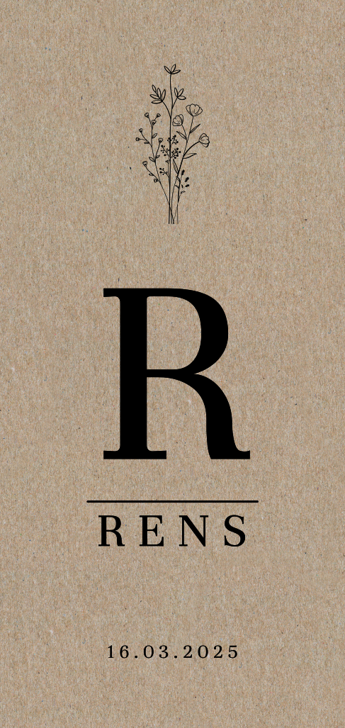 Natuurlijk geboortekaartje voor je pasgeboren zoon met illustratie veldboeket en initiaal op kraft papier.