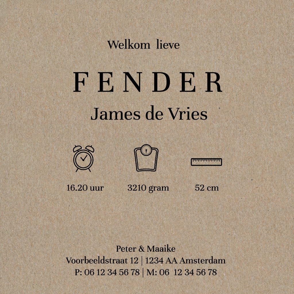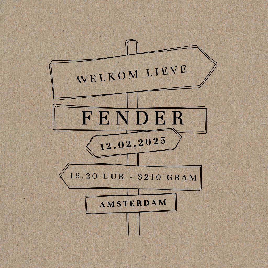 Hippe geboortekaart voor de geboorteaankondiging van je zoon met een wegwijzer op een stoere kraft karton achtergrond.
