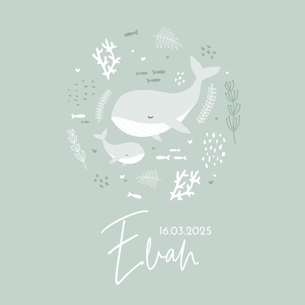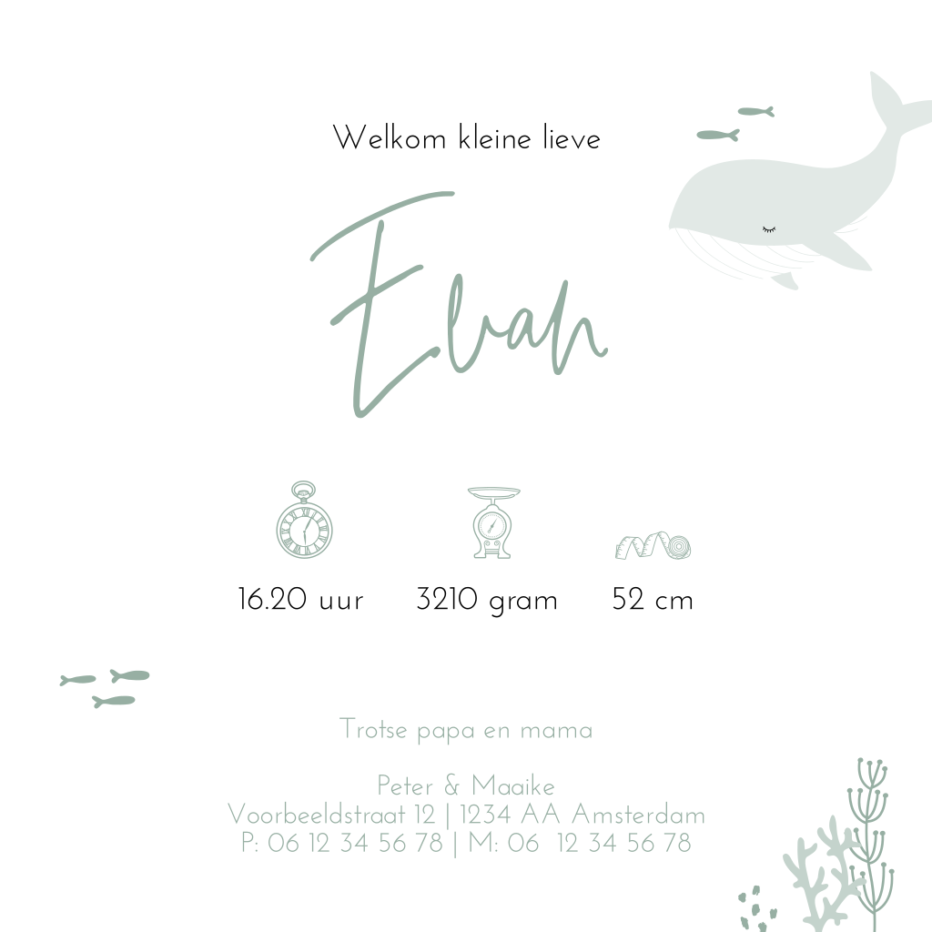 Hippe geboortekaart voor de geboorteaankondiging van je zoontje met trendy illustraties van zeedieren zoals walvisjes en zeewier plantjes op een zeegroene achtergrond.