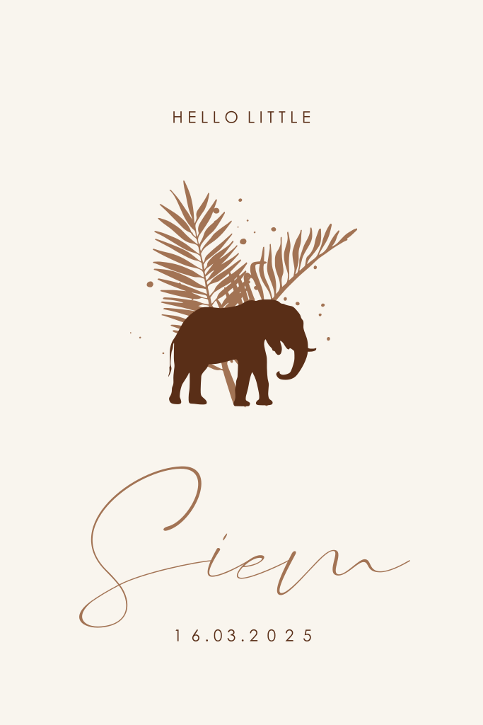 Op dit kaartje, wat een gebroken witte kleur heeft, staat een silhouetje van een olifantje in de jungle. Perfect voor jullie pasgeboren zoontje!