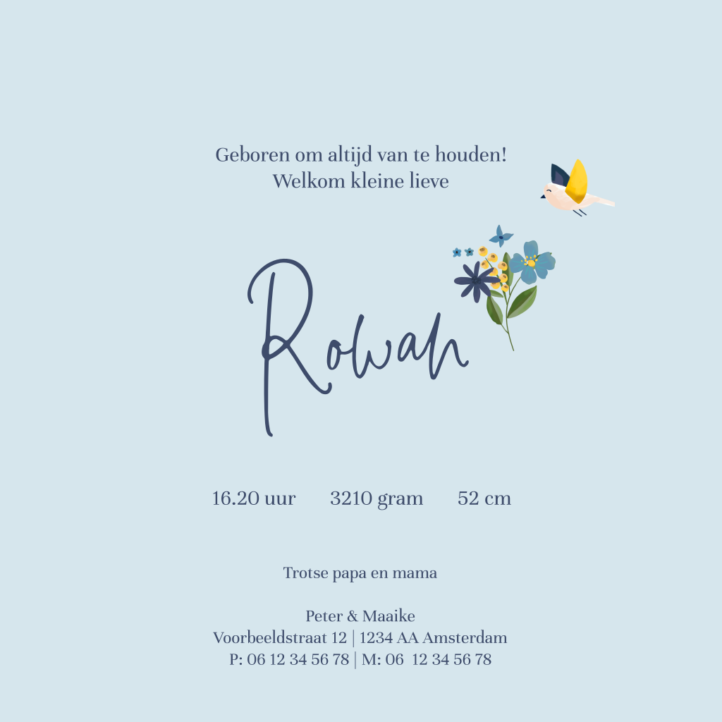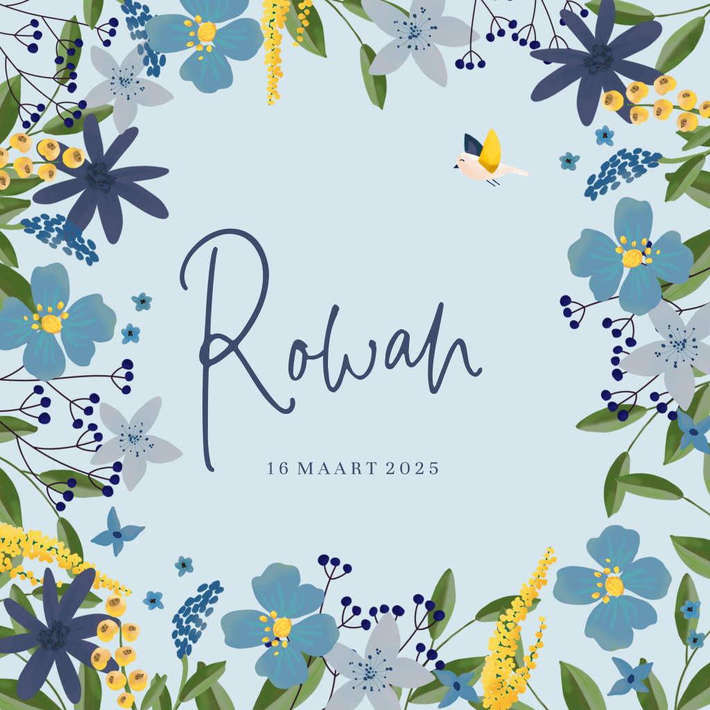 Het perfecte babykaartje voor wanneer jullie kleintje in de lente of zomer geboren wordt. De achtergrond is lichtblauw en rondom de prachtige naam van jullie kleintje staan vrolijke bloemen in verschillende kleuren en vormen.