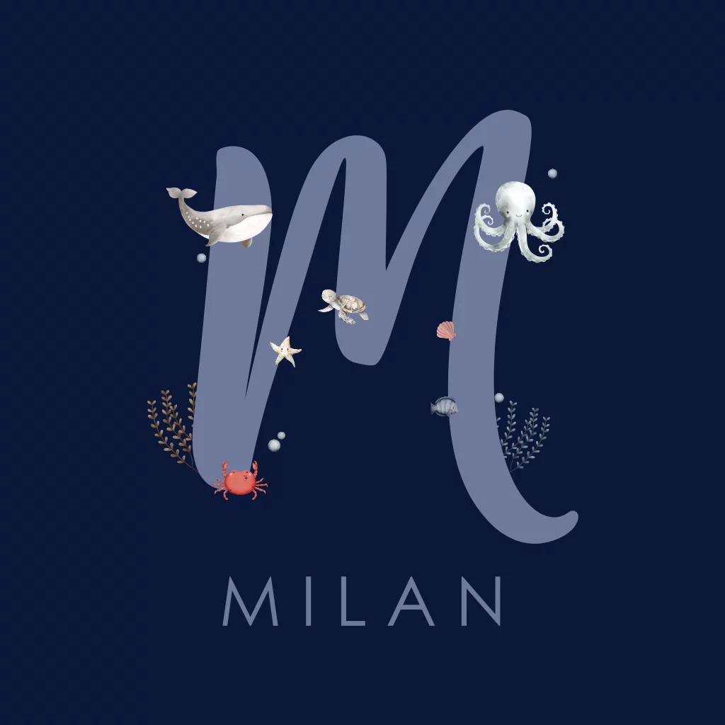 Een stoer en hip geboortekaartje voor jouw kindje. Het kaartje heeft een donkerblauwe achtergrond met daarop het initiaal van jouw kindje. Ook zie je verschillende onderwaterdieren. Pas het ontwerp naar wens aan in onze online editor.