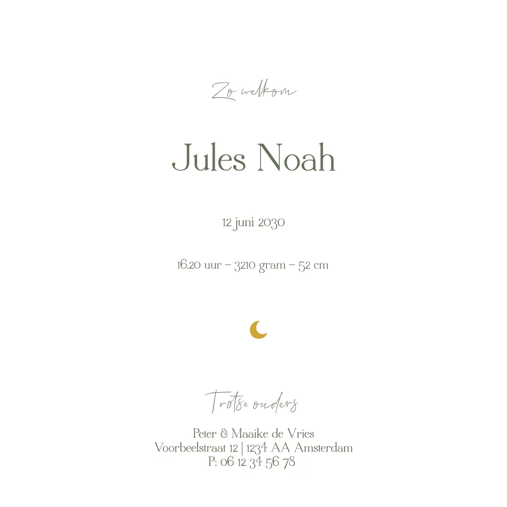 Een stijlvol en tijdloos vierkant geboortekaartje voor jullie kleintje. Het kaartje heeft een zachte uitstraling door de groene kleur en folie details. Pas het ontwerp naar wens aan in onze online editor.