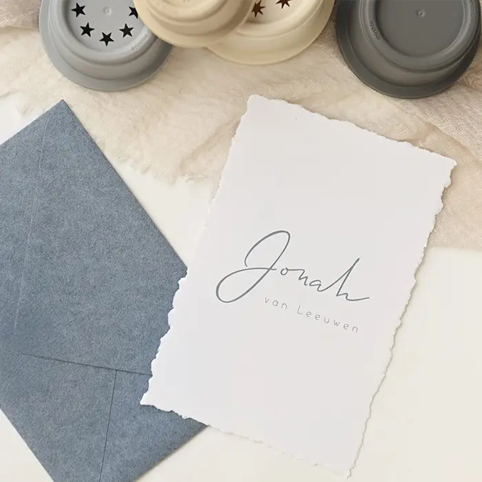 Wat een tof geboortekaartje! Dit kaartje heeft een klassieke en minimalistische uitstraling met blauwe letters. Het kaartje heeft een geschept papier look die je zelf aan het kaartje geeft. Al onze kaartjes met handgeschept papier vind je hier.