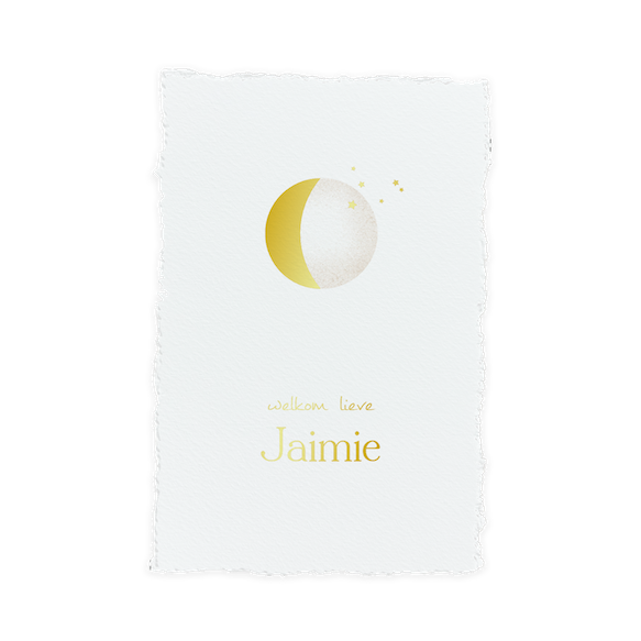 Wat een tof geboortekaartje! Dit kaartje heeft een klassieke en minimalistische uitstraling met een klein goudfolie maantje. Het kaartje heeft een geschept papier look die je zelf aan het kaartje geeft. Al onze kaartjes met handgeschept papier vind je hier.