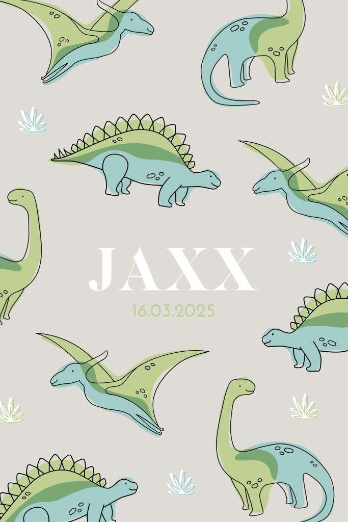 Een vrolijk geboortekaartje met speelse dino's in echte jongens kleuren. Het geboortekaartje heeft dino's in de kleuren groen en blauw op een zandkleurige achtergrond. De dino's zijn met lijntekeningen getekend en iets buiten de lijntjes ingekleurd wat een speels effect geeft. Het kaartje heeft ronde hoeken die hem net even anders maken dan een gewoon kaartje.