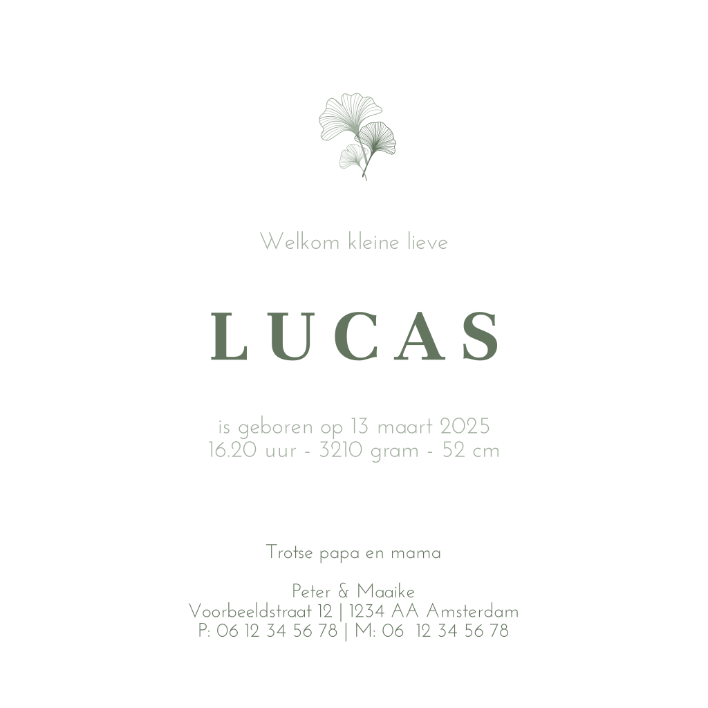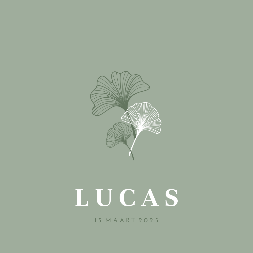 Hip geboortekaartje voor je pasgeboren zoon met stijlvolle ginkgo blaadjes op een olijfgroene achtergrond.