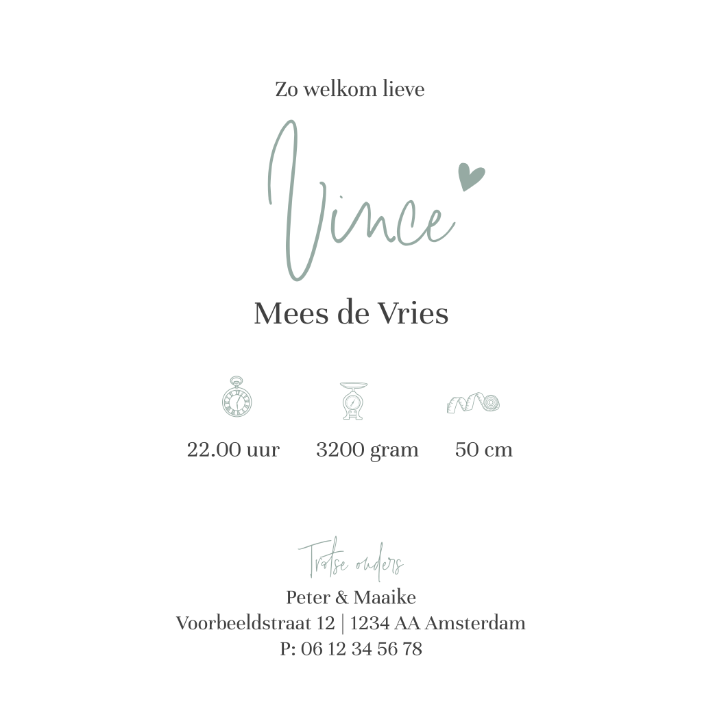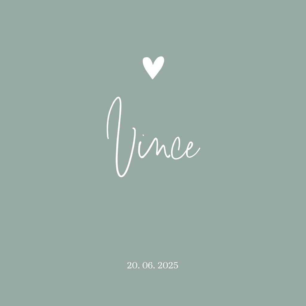 Hip geboortekaartje voor de geboorteaankondiging van je zoontje met een lief hartje op een achtergrond in pasteltint blauwgrijs. Echt een hippe trendkleur!