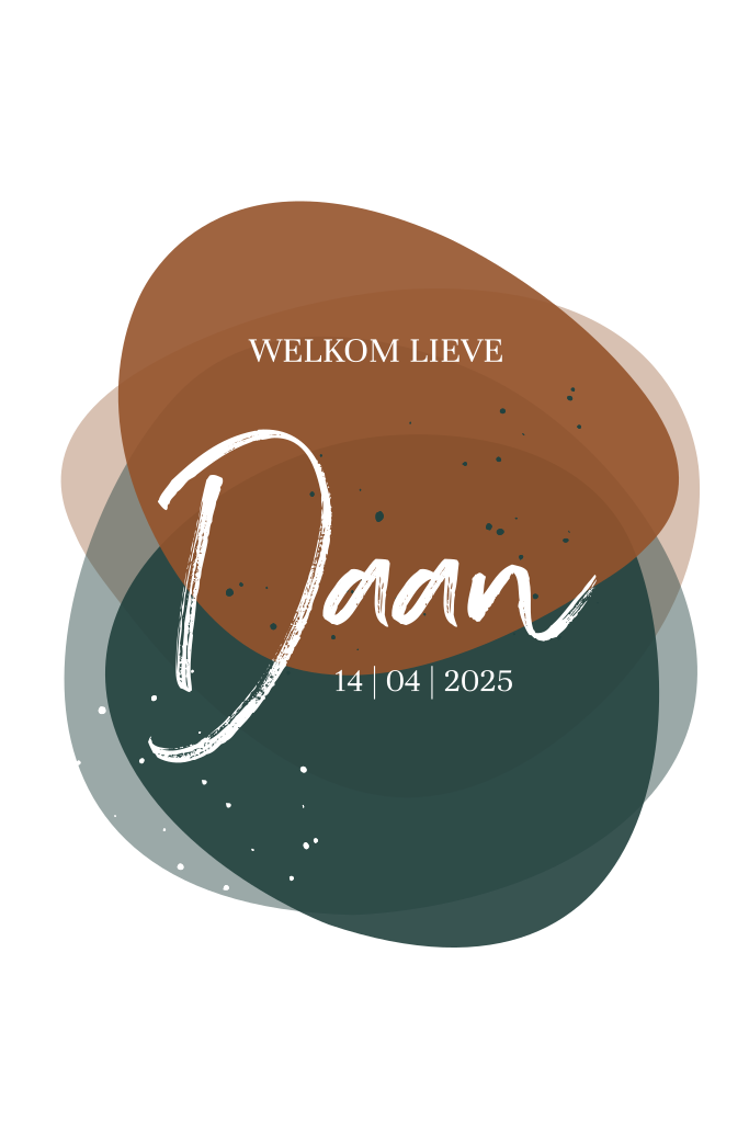 Hippe geboortekaart voor je pasgeboren zoontje met organische vormen in trendkleuren zoals roestbruin en donkergroen. Kies een hippe lettertype en schrijf een persoonlijk tekst om dit geboortekaartje compleet te maken!