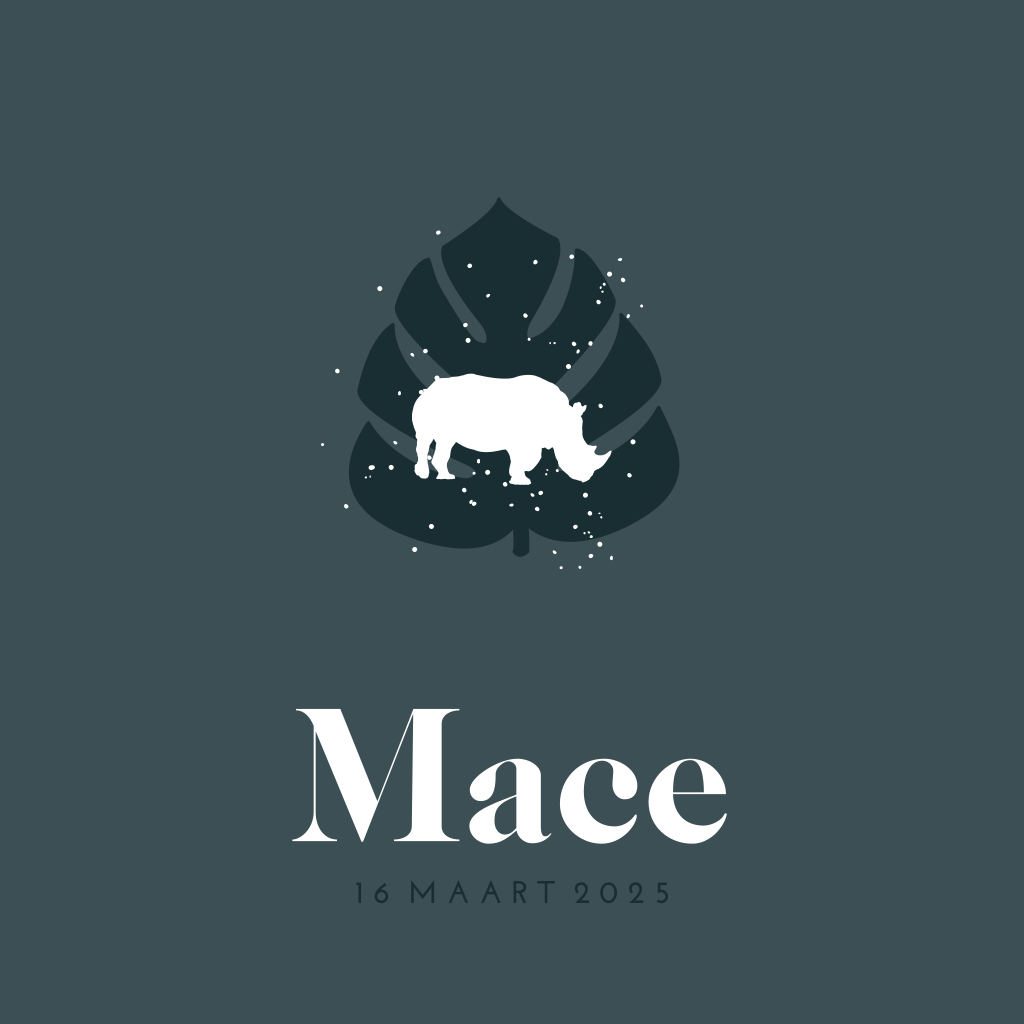 Minimalistisch geboortekaartje voor zoontje met lieve neushoorn en jungle blad.