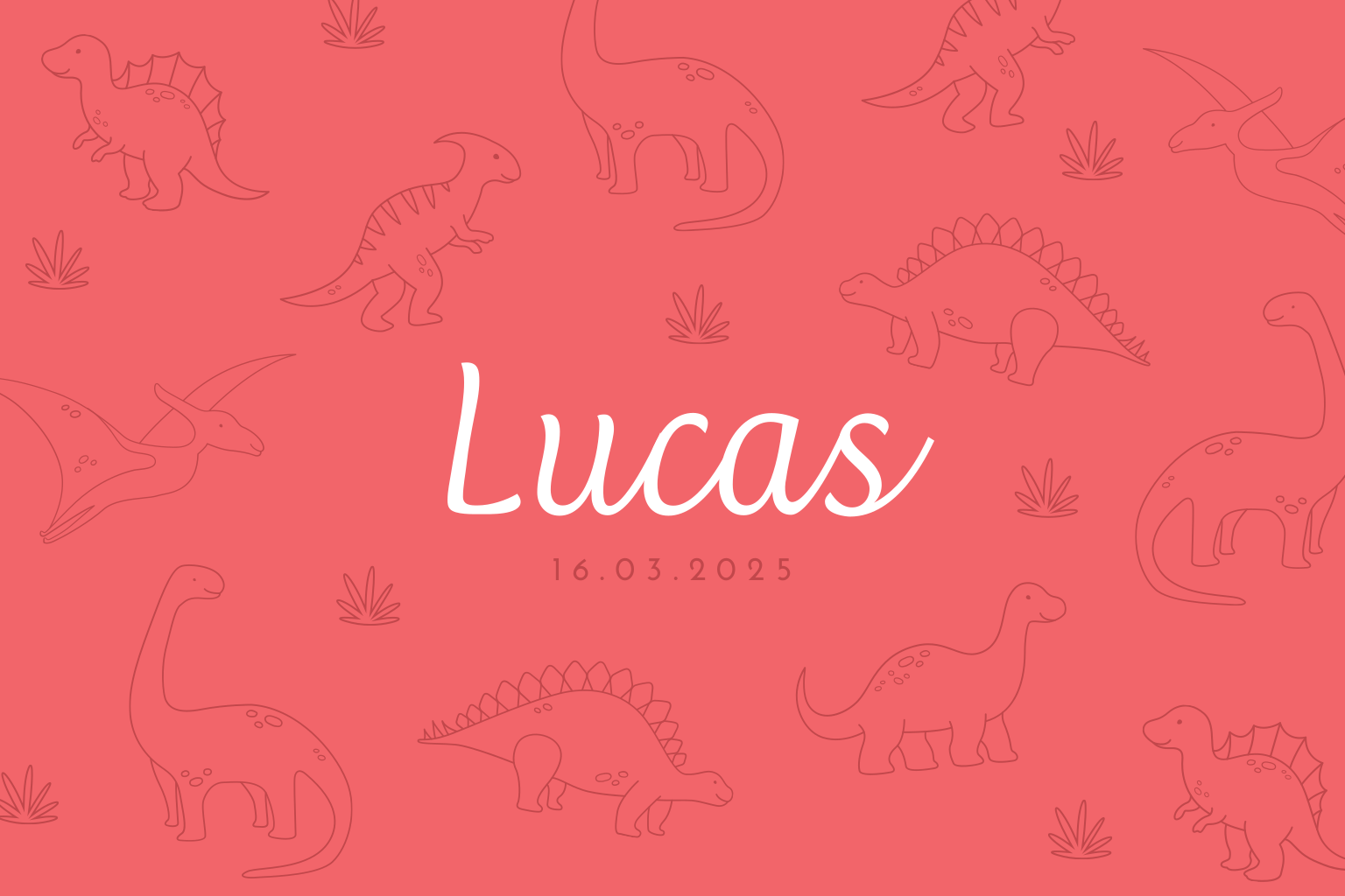 Een vrolijk geboortekaartje voor de geboorte van jullie zoontje. Het kaartje heeft vrolijke lijntekeningen van verschillende dino's op een rode achtergrond. De naam van jullie kindje staat in het midden van het kaartje in sierlijke letters geschreven. Het kaartje is extra vrolijk door de ronde hoeken die het kaartje net even anders maken.