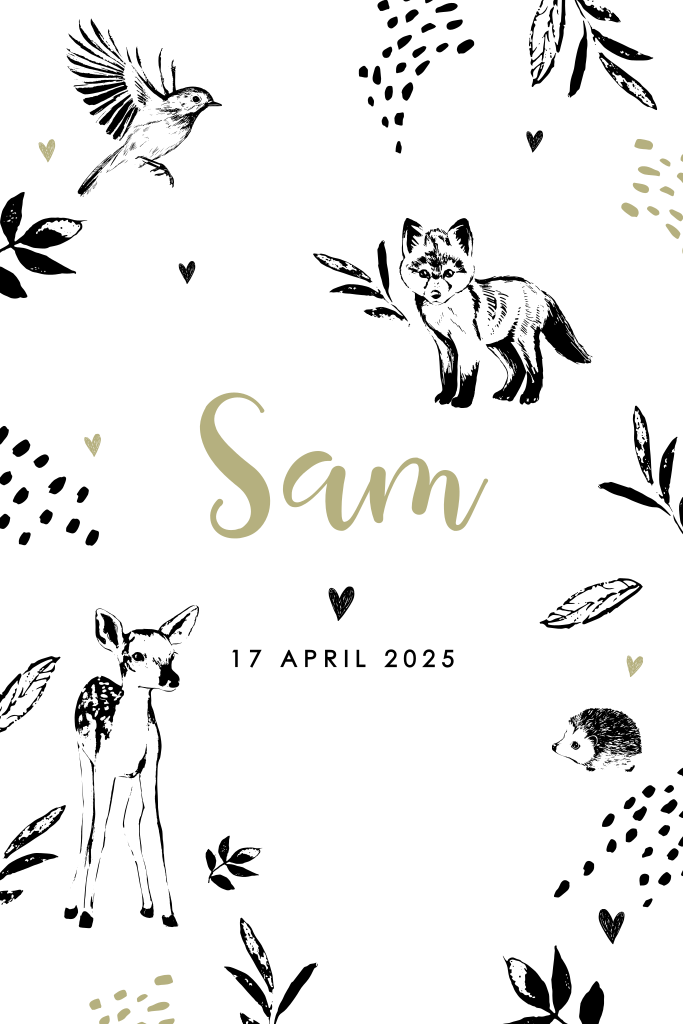 Dit is een stoer geboortekaartje voor jullie zoontje. Op het kaartje staan verschillende zwart-wit illustraties van bosdieren. Pas het kaartje naar wens aan in onze online editor en bestel snel een proefdruk om dit kaartje in het echt te zien!