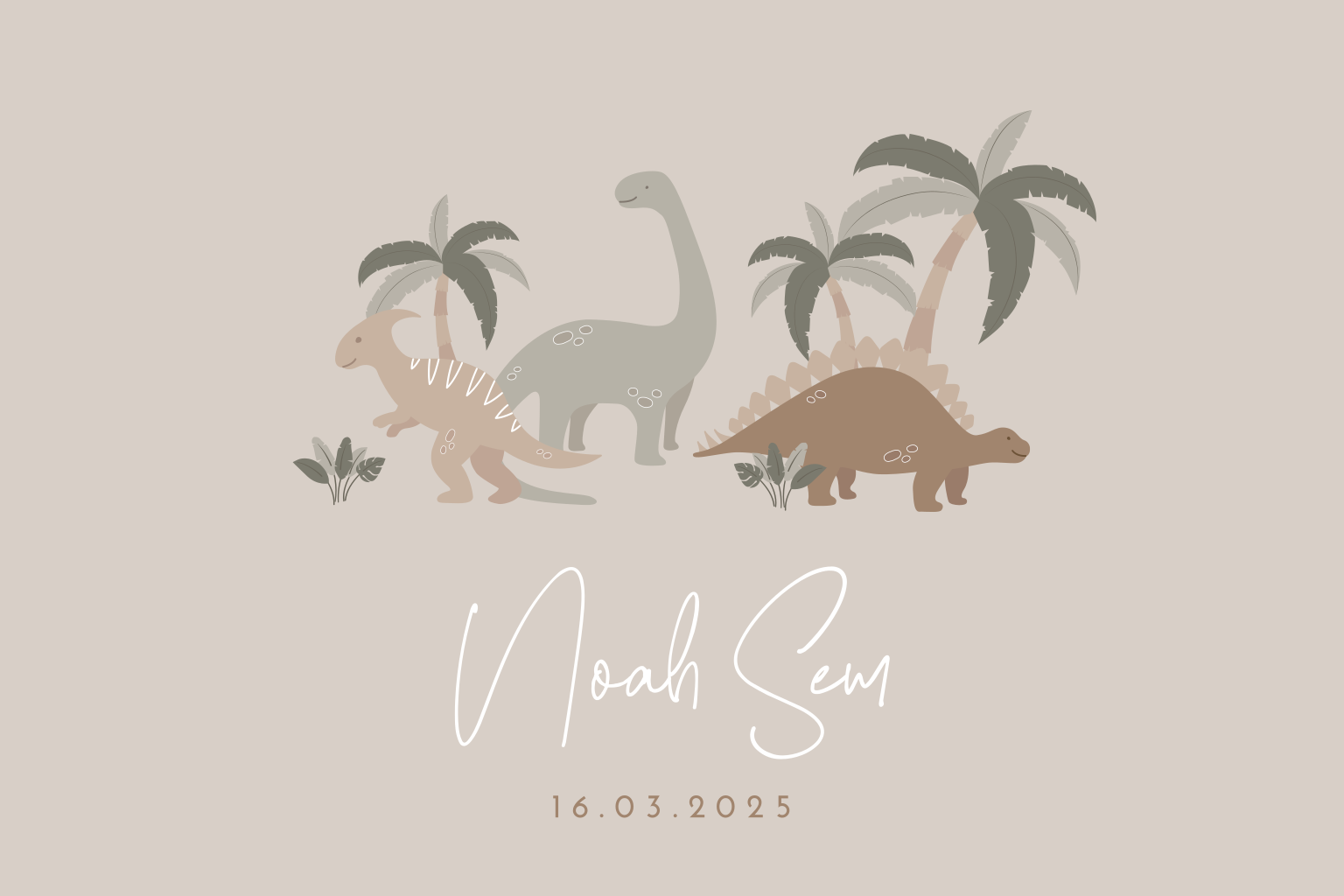 Een stoer geboortekaartje voor de geboorte van jullie zoontje. Het kaartje heeft een zandkleurige achtergrond met daarop verschillende dino's tussen de palmbomen. De ronde hoeken maken het kaartje speels en helemaal compleet. De naam van jullie kleintje staat onder de dino's in sierlijke letters geschreven. Maak het kaartje helemaal naar je eigen wens in onze online editor, bestel een proefdrukje en bekijk het kaartje thuis.