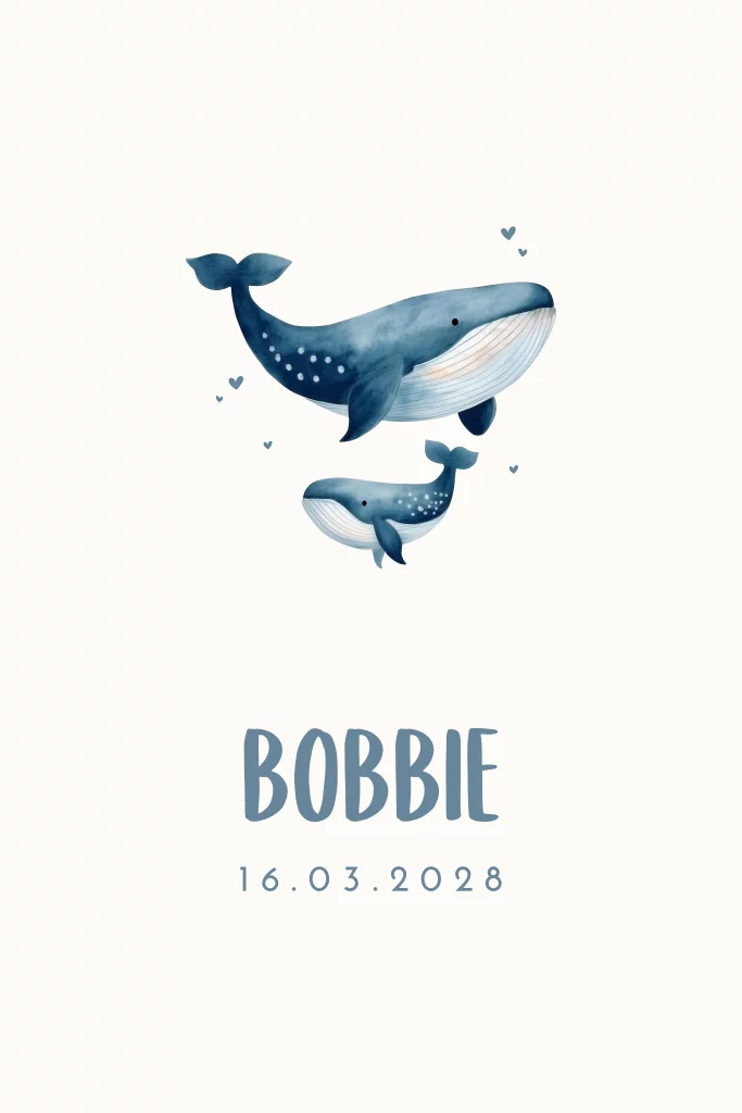 Een lief en vrolijk geboortekaartje voor jouw kindje. Het kaartje heeft afgeronde hoeken en een schattige illustratie van twee walvissen. Pas het ontwerp naar wens aan in onze online editor.