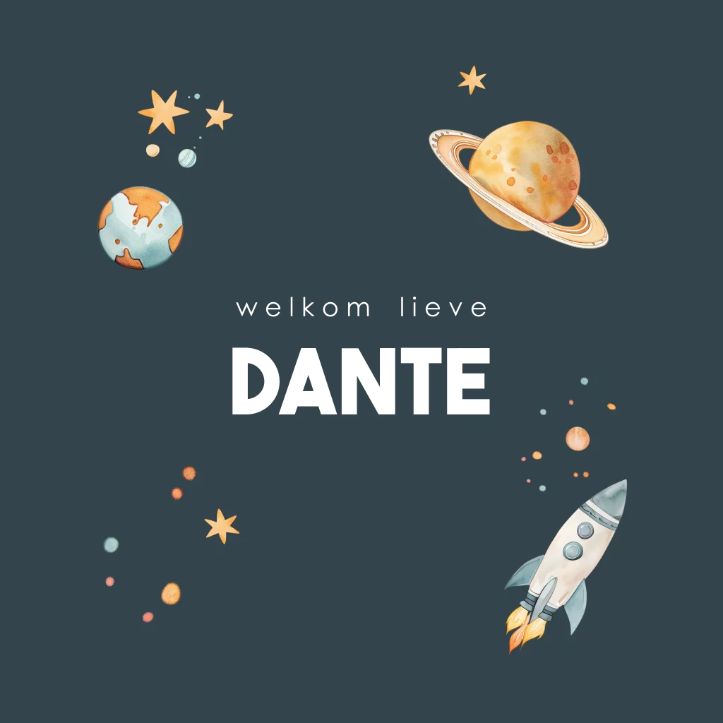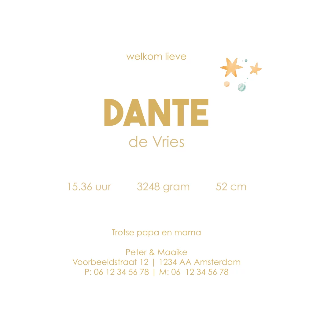Een tof geboortekaartje voor een jongen.Dit kaartje heeft een blauwe achtergrond met ruimte thema. Je ziet planeten, sterren en een racket. De naam wordt gedrukt in goudfolie. Pas het ontwerp naar wens aan in onze online editor.