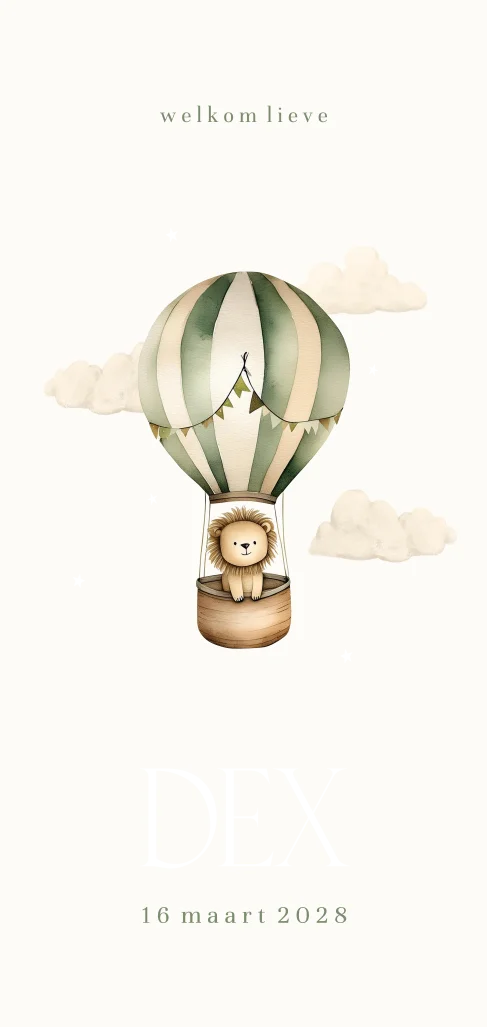 Wat een lief geboortekaartje! Dit kaartje heeft een langwerpig formaat met schattige illustraties. Het kaartje heeft lieve wolkjes een groene luchtballon met daarin een vrolijk leeuwtje. Pas het ontwerp naar wens zelf aan.Dit product maakt onderdeel uit van deze set.