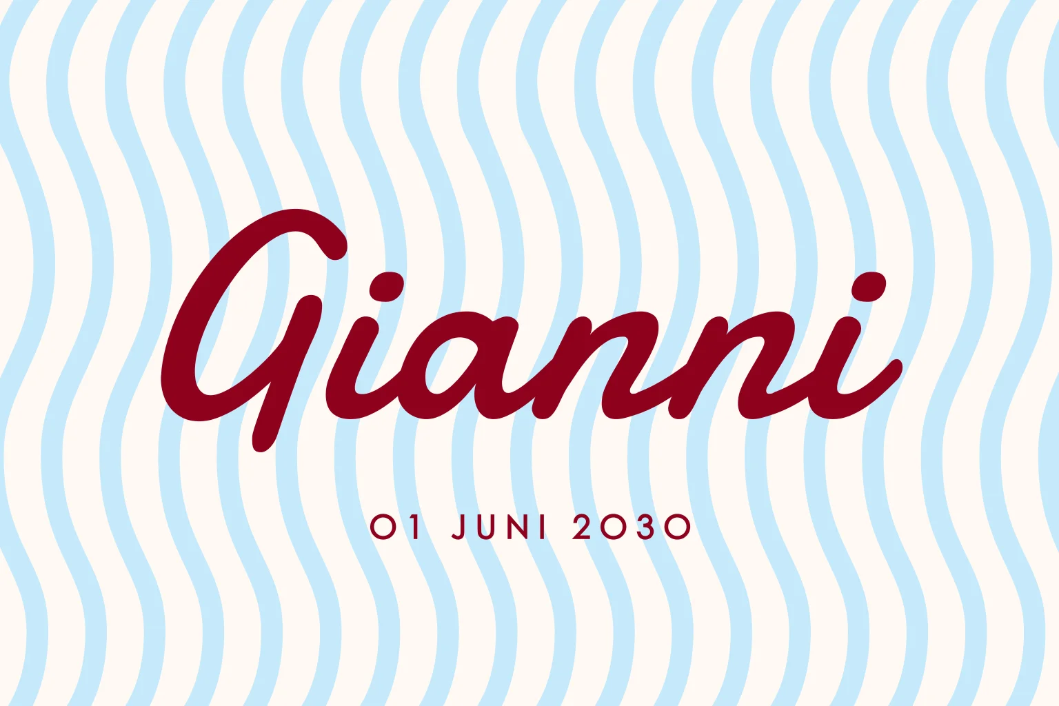 Grappig geboortekaartje met blauwe golvende strepen en rode naam