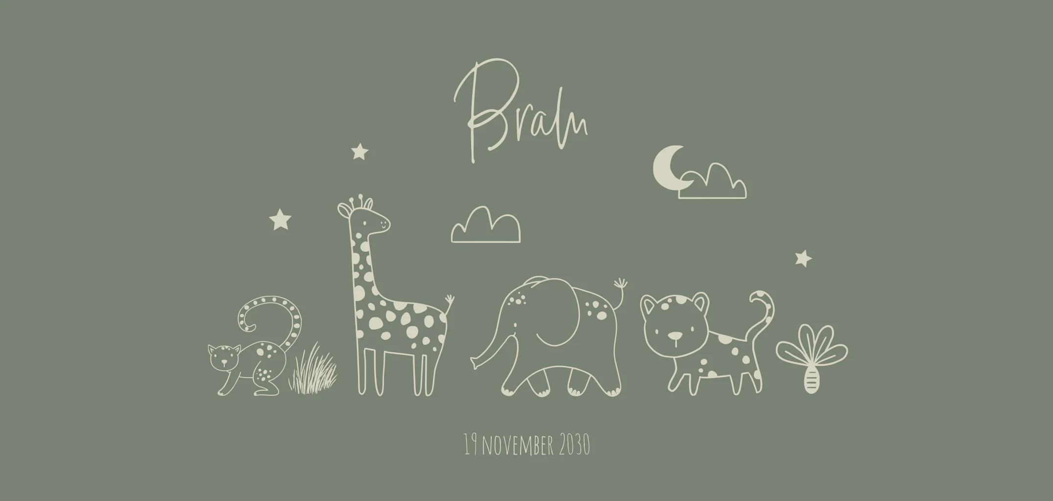 Dit is een avontuurlijk geboortekaartje voor jullie zoon. Het kaartje heeft een groene achtergrond waarop de tekeningen van jungledieren, wolkjes, sterretjes en een maantje te zien zijn. Het kaartje kan helemaal naar wens aangepast worden in onze online editor.
