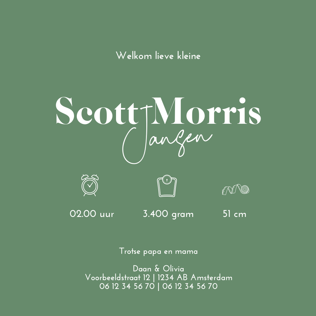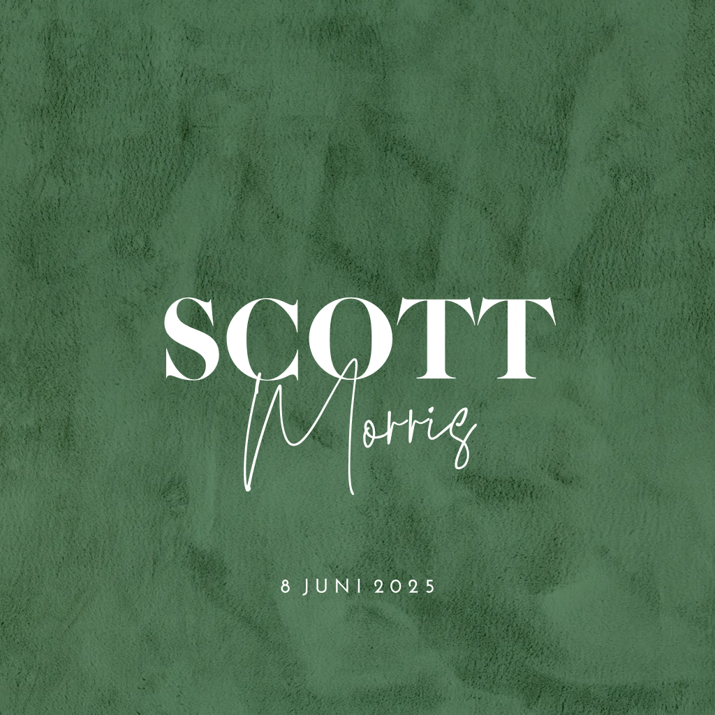 Een stoer en hip geboortekaartje voor jullie toekomstige zoontje. Het kaartje heeft een groene velvet-look achtergrond. Het kaartje krijgt een luxe uitstraling door de naam gedrukt goudfolie. Pas dit kaartje aan in onze online editor en bestel een proefdruk om het kaartje in het echt te bewonderen.