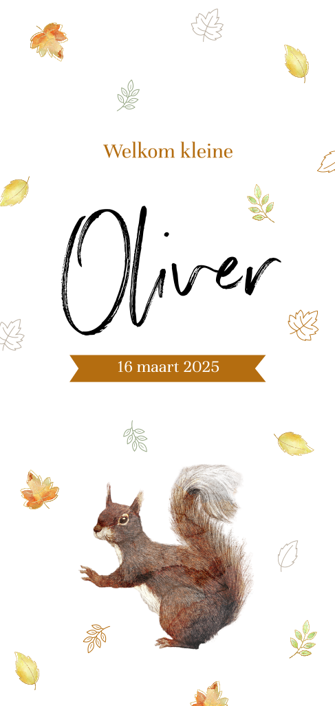 Herfst geboortekaartje voor jongen met eekhoorntje en blaadjes