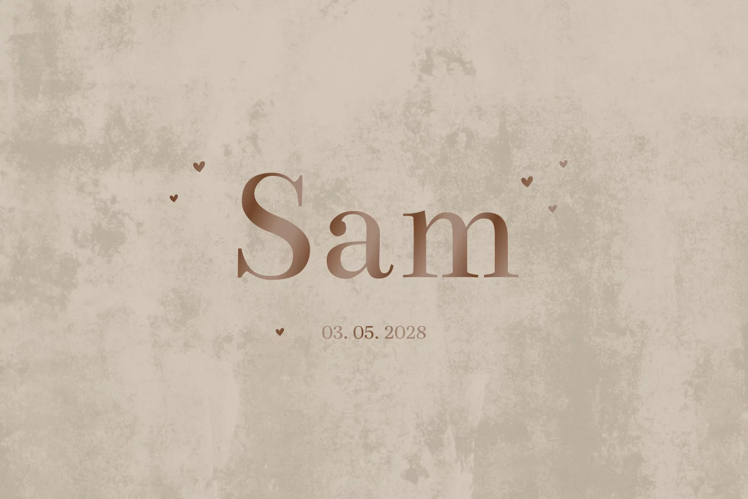 Kondig de geboorte van jullie zoon of dochter aan met dit stoere kaartje! Het kaartje heeft een bruine velvet-look achtergrond. De naam en de kleine hartjes worden gedrukt in hoogglans. Pas het kaartje naar wens aan in onze online editor en bestel een proefdruk om dit kaartje in het echt te zien!