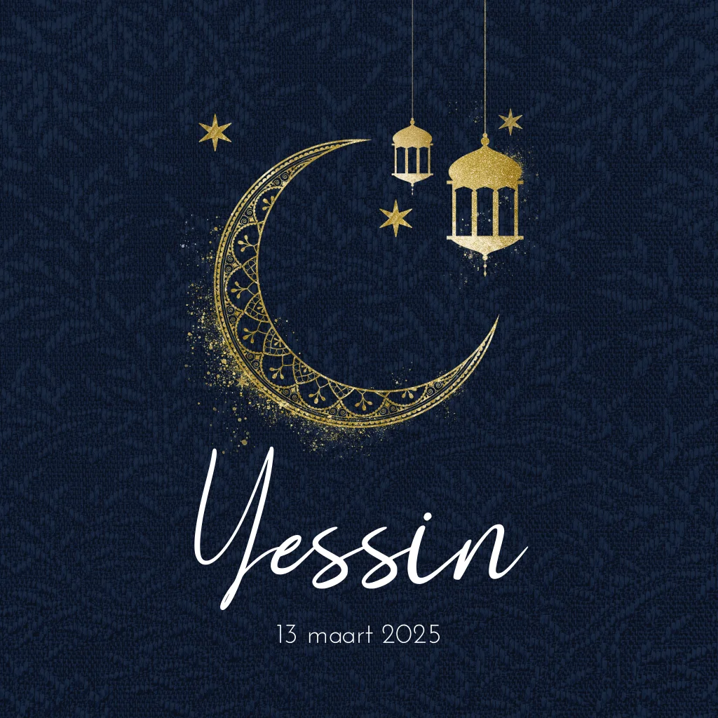 Een prachtig geboortekaartje met arabische details voor de geboorte van jullie zoontje. De kaart heeft een donkerblauwe achtergrond met daarop in het goud een maan en olielampjes. Aan de binnenkant van het kaartje staan ook de maan en de olielampjes in het goud gedrukt. De ronde hoeken maken dit kaartje extra speciaal. Pas de naam van jullie zoontje makkelijk en snel aan in de online editor, bestel een proefdrukje en bekijk het kaartje thuis!